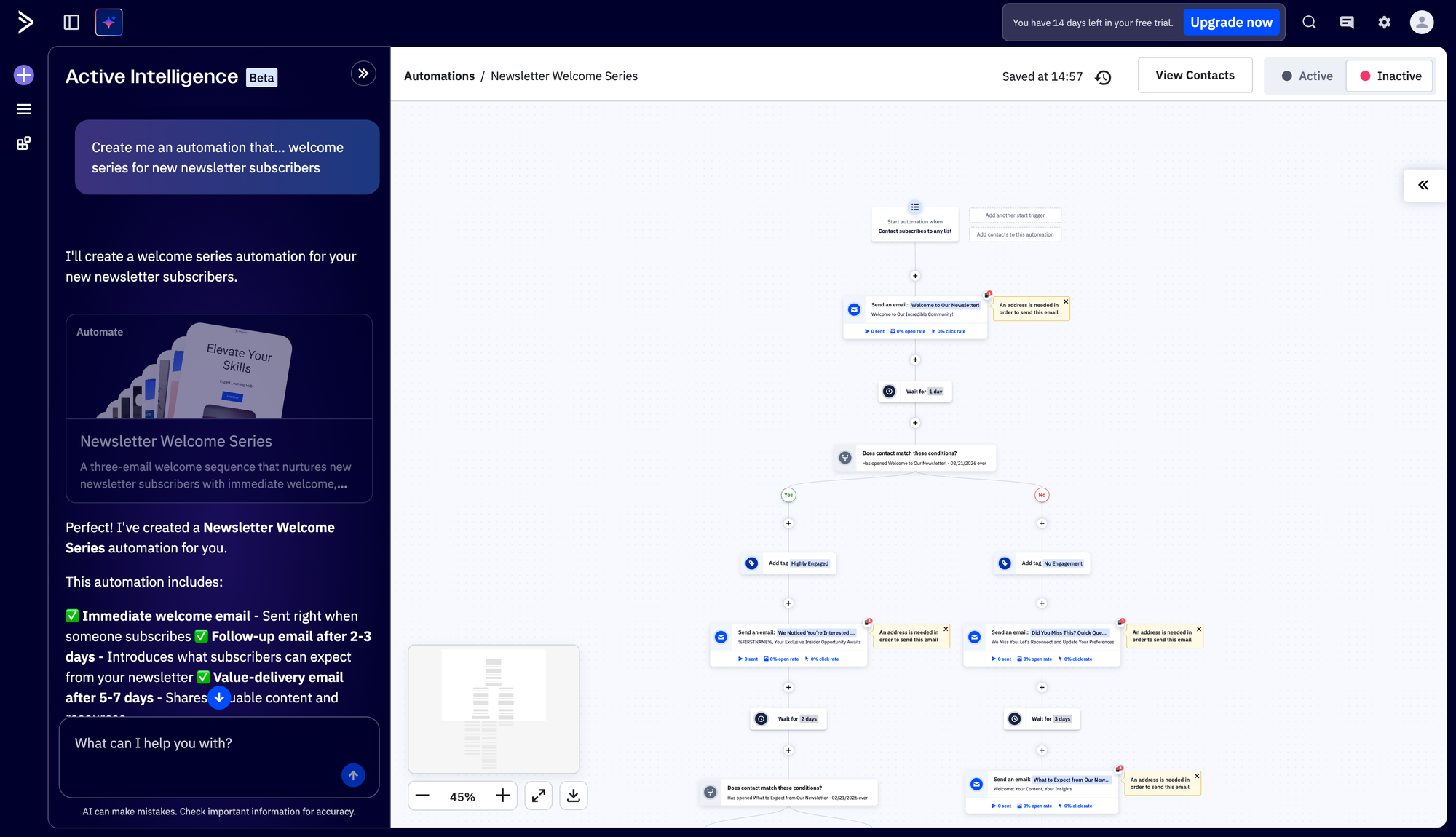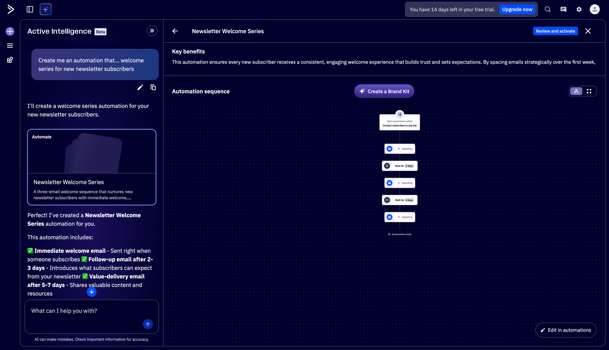 Active Intelligence opened a full-screen chat interface and responded: "I'll create a welcome series automation for your new newsletter subscribers."