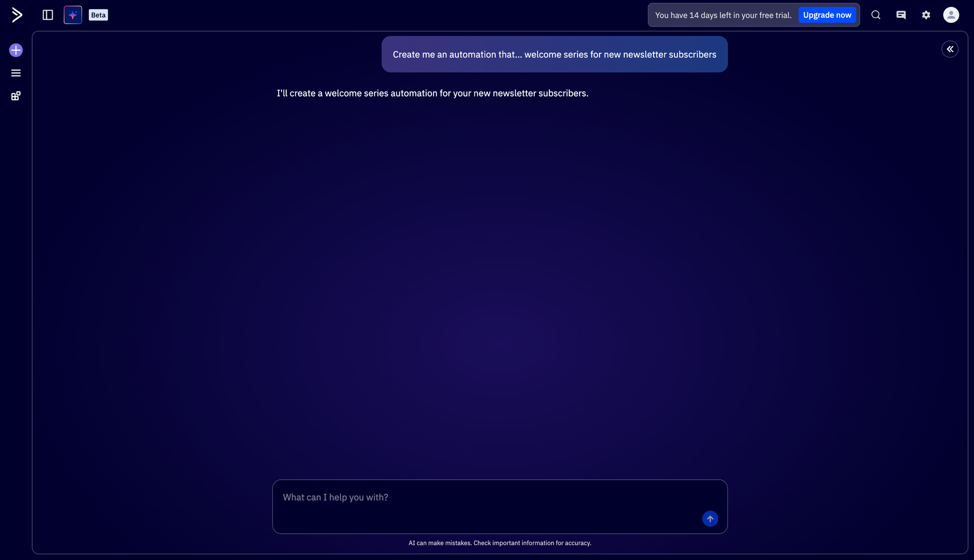 I typed: "Create me an automation that... welcome series for new newsletter subscribers"